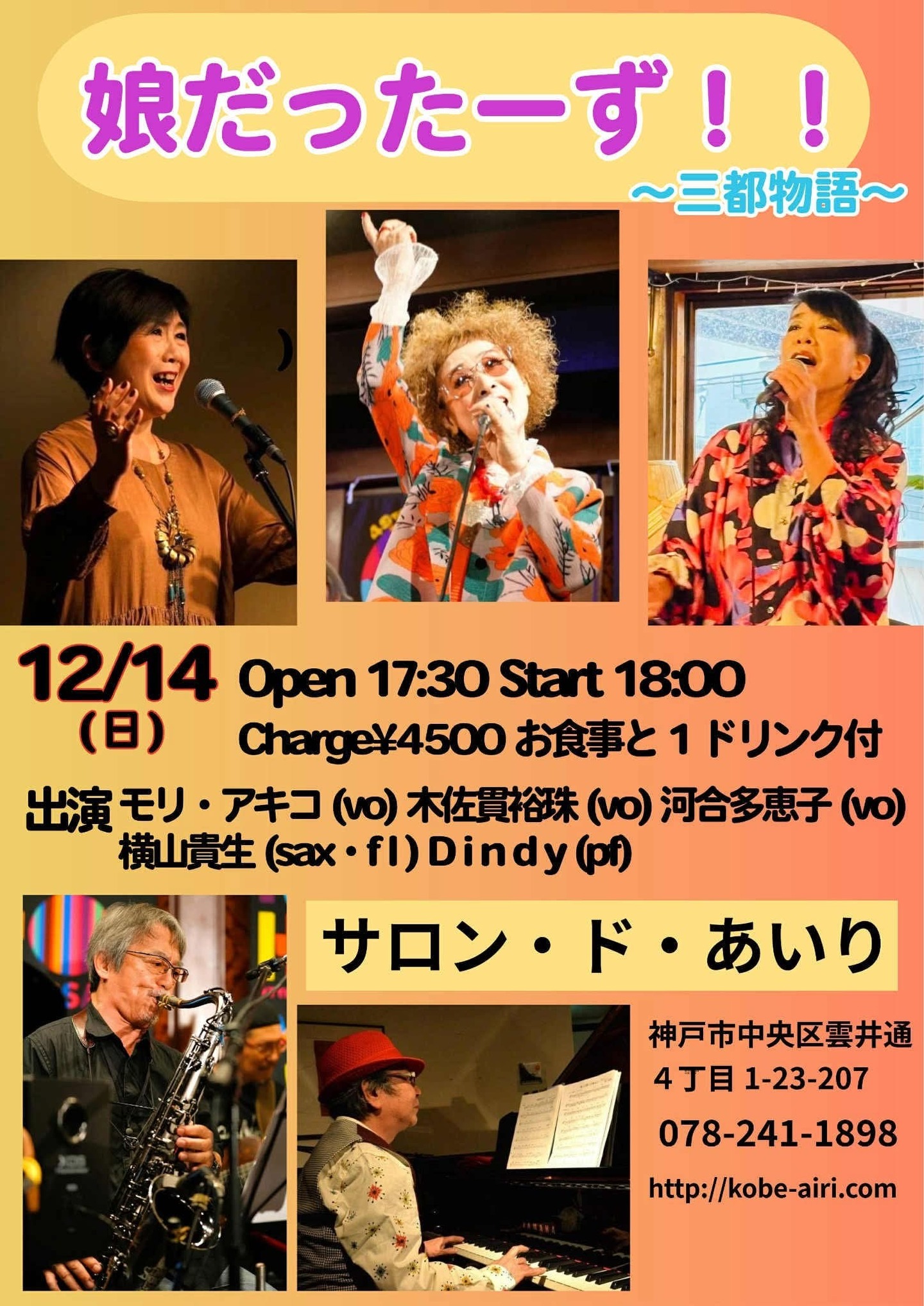 出演:モリ・アキコ(Vo)、木佐貫裕珠(Vo)、河合多恵子(Vo)、横山貴生(Sax・Fl)、Dindy(Pf・Cho)