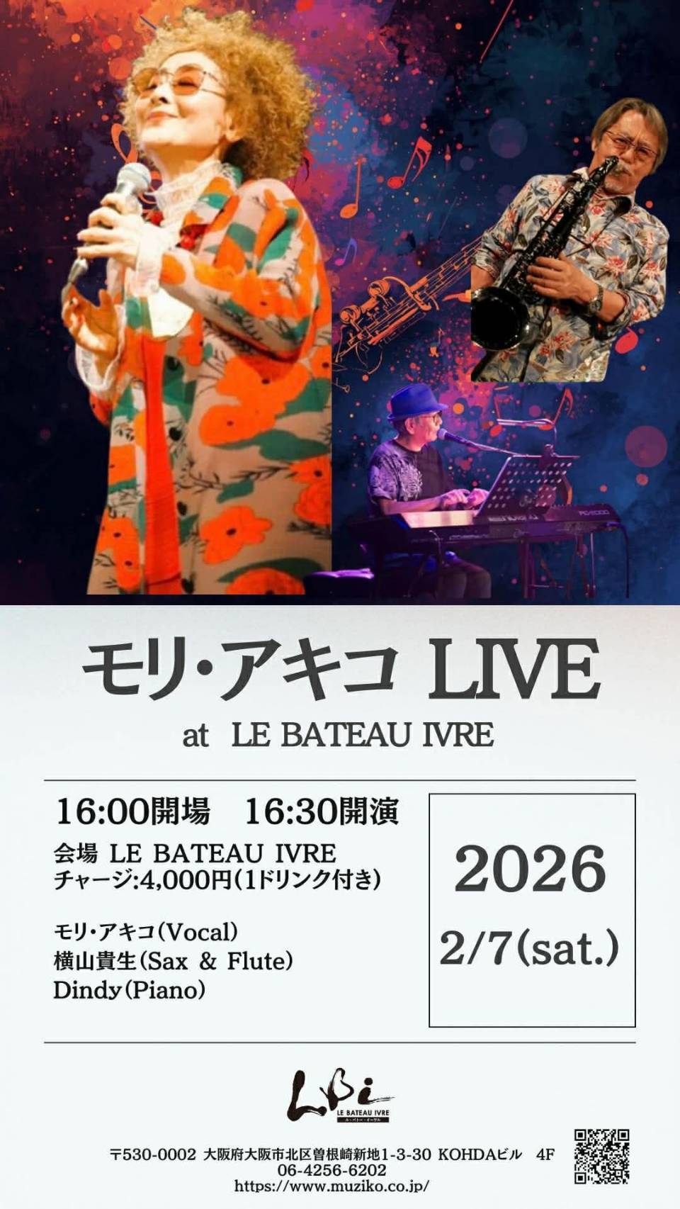 出演:モリ・アキコ(Vo)、横山貴生(Sax&Fl)、Dindy(Pf&Cho)